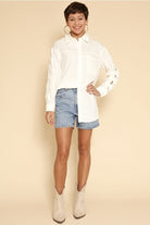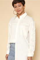 Bow Sleeve Button Up Shirt features charming bow details on the sleeves combined with classic button-front styling that creates feminine, professional appeal with playful accents. The bow embellishments make ordinary sleeves feel special and romantic while the structured shirt design maintains polished versatility. Perfect for office wear, casual meetings, or when you want a blouse that balances professional styling with sweet, feminine charm and personality.