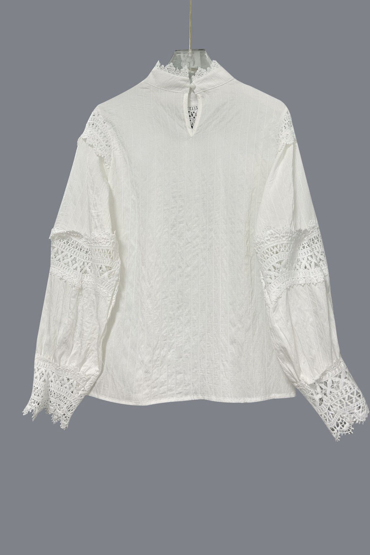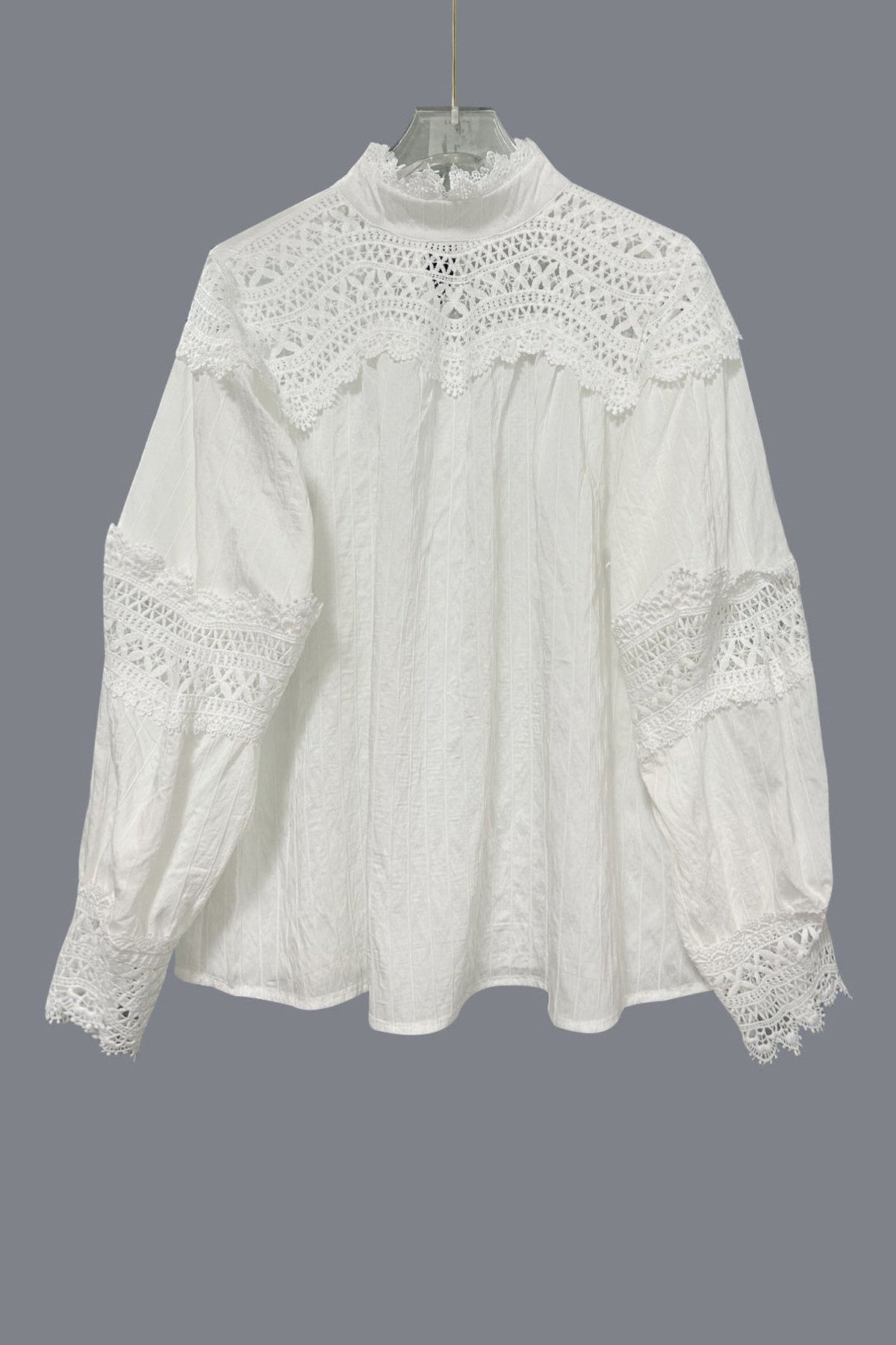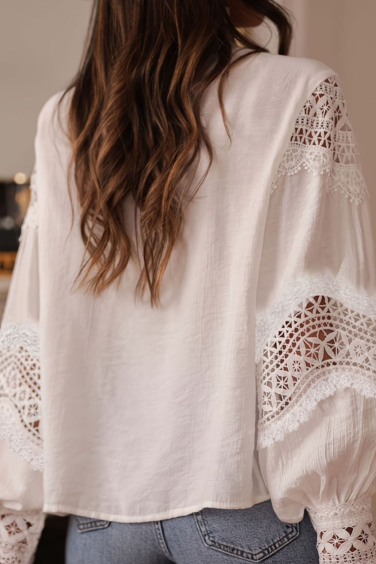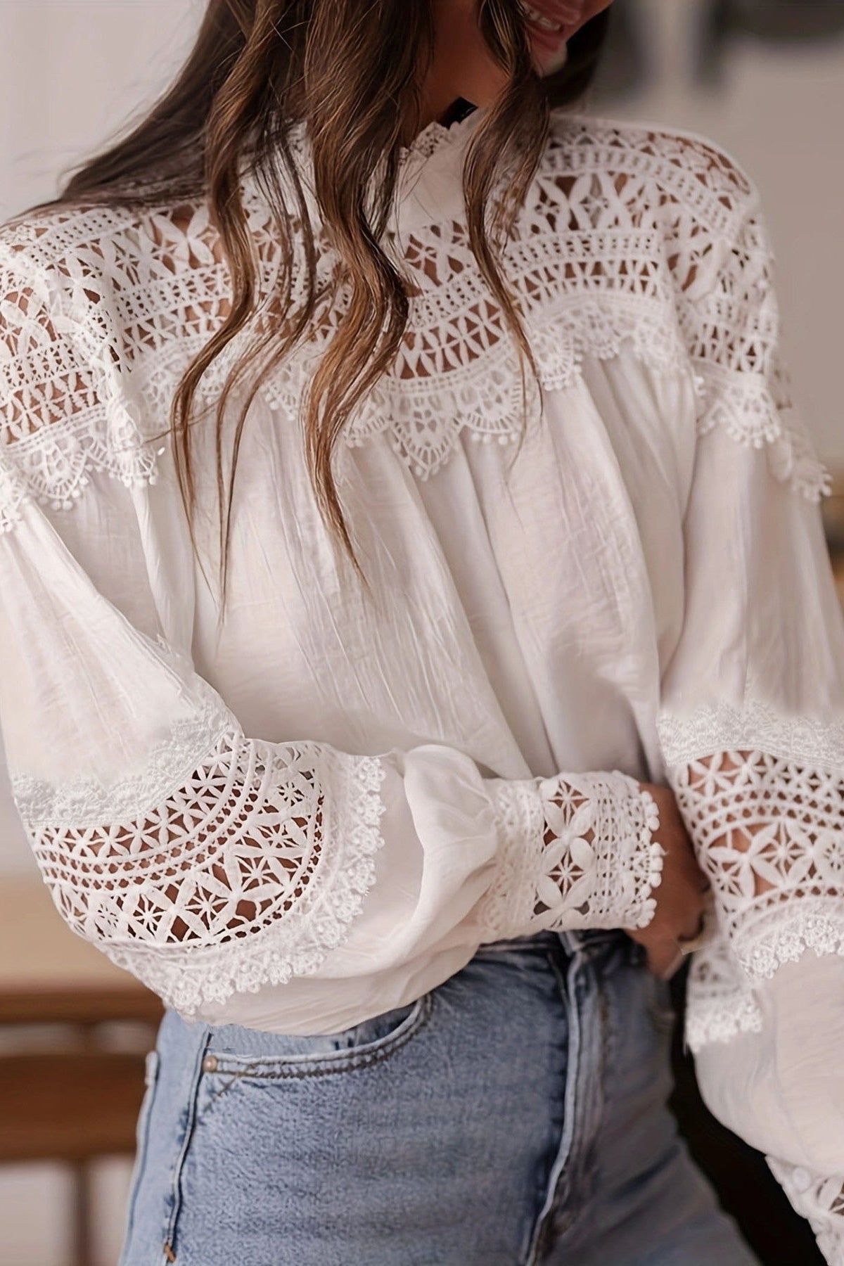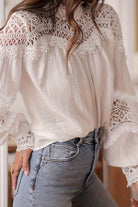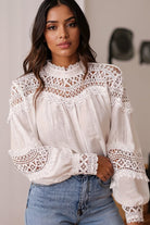 Crochet Lace Detail Long Sleeve Blouse features handcrafted crochet accents woven throughout soft fabric with comfortable long sleeves that create artisanal charm and feminine appeal. The intricate lace details make this blouse feel special and unique while the flowing silhouette provides comfortable coverage for any occasion. Perfect for office wear, casual dates, or layering when you want handmade beauty with modern wearability.