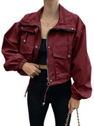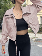 Crop Drawstring Hem Zip Up Jacket features adjustable drawstring at the bottom hem with full zip closure and trendy cropped length for customizable styling. The drawstring detail allows you to cinch the waist for a fitted look or leave loose for relaxed comfort. Perfect for layering over high-waisted bottoms, athleisure wear, or when you want outerwear that offers versatile styling options with modern proportions.