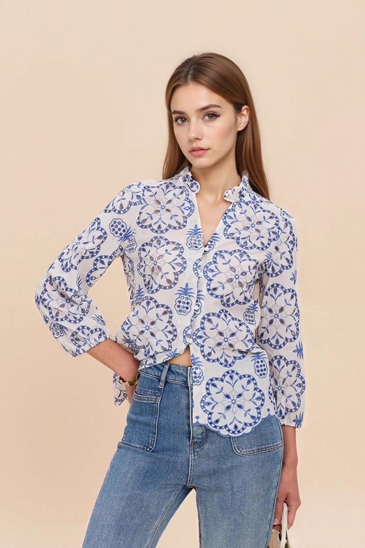 Eyelet Embroidered Long Sleeve Shirt showcases intricate eyelet patterns with detailed embroidery that creates beautiful texture and artisanal appeal across comfortable long sleeves. The breathable eyelet fabric keeps you comfortable while the embroidered details make this shirt feel handcrafted and special. Perfect for professional settings, casual outings, or layering when you want a blouse that combines classic elegance with modern wearability.