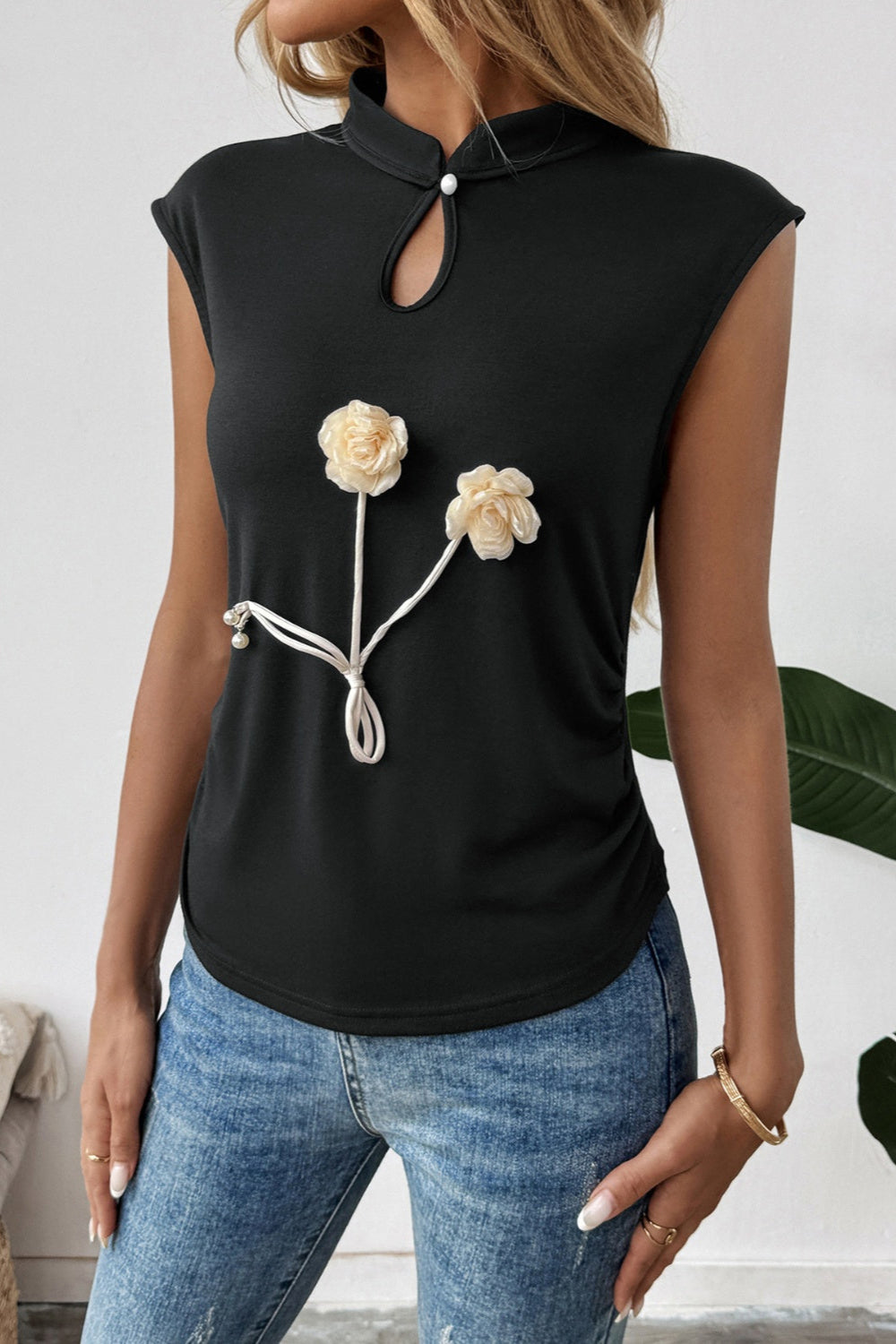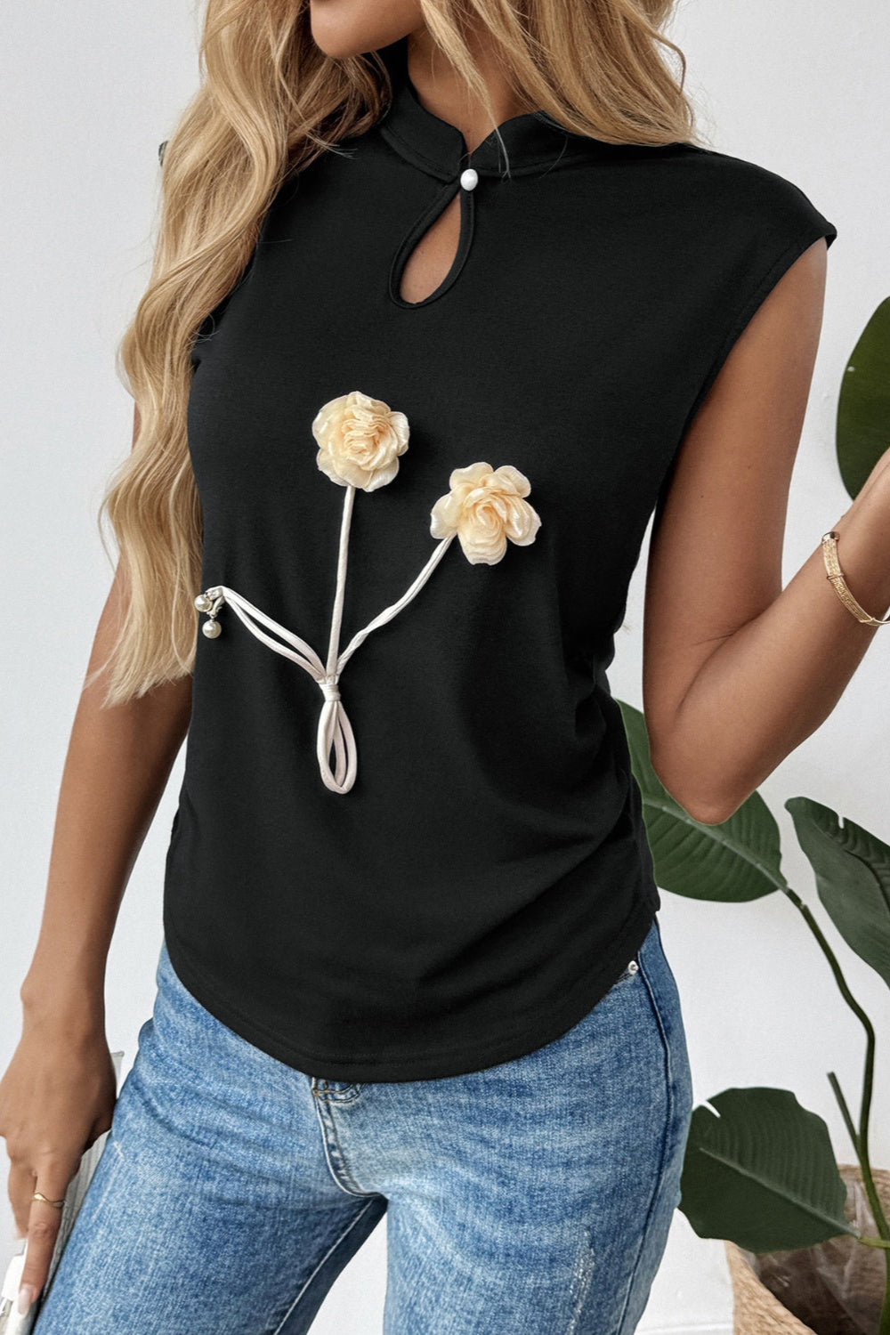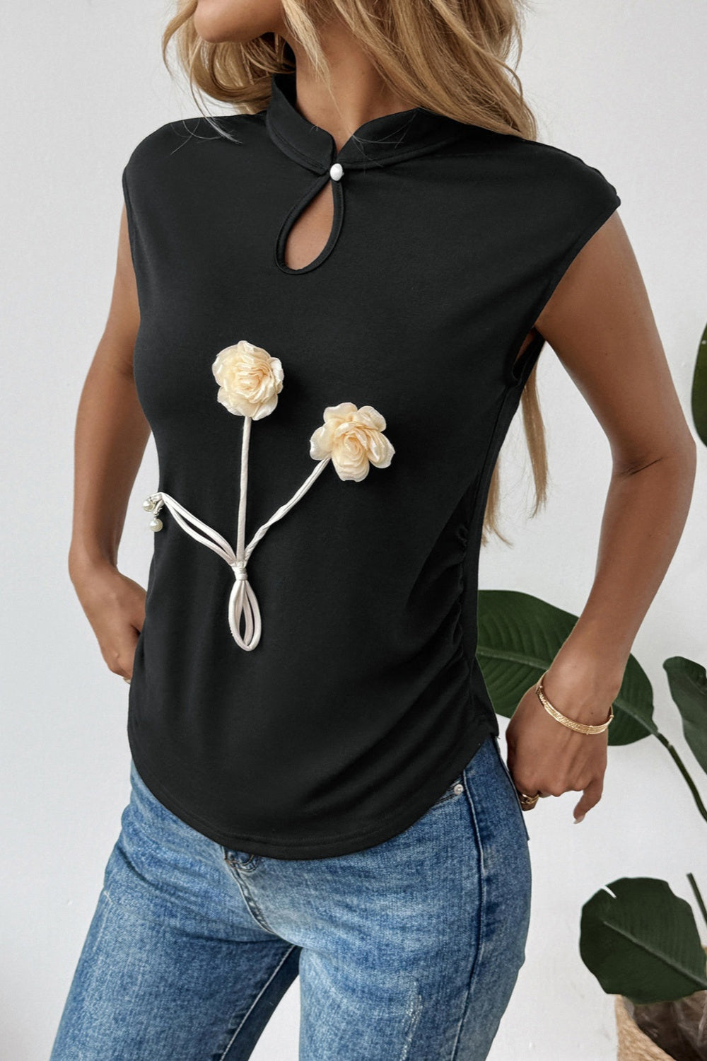 Floral Applique Keyhole Top features beautiful dimensional flower details that create texture and visual interest around a flattering keyhole neckline. The applique work makes this top feel special and handcrafted while the keyhole cutout provides a subtle peek of skin that feels feminine and modern. Perfect for date nights, special occasions, or when you want your outfit to have artistic flair and romantic charm.