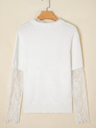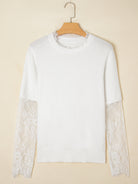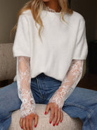 Lace Sleeve Faux Two-Piece Fuzzy Sweater combines feminine elegance with cozy comfort in one stylish design. Featuring delicate lace sleeves that create a layered illusion over soft, fuzzy knit fabric, this sweater offers sophisticated texture contrast. The faux two-piece construction provides the polished look of layering without the bulk. Perfect for transitional seasons, it pairs beautifully with jeans or skirts for versatile styling from casual brunches to office settings.