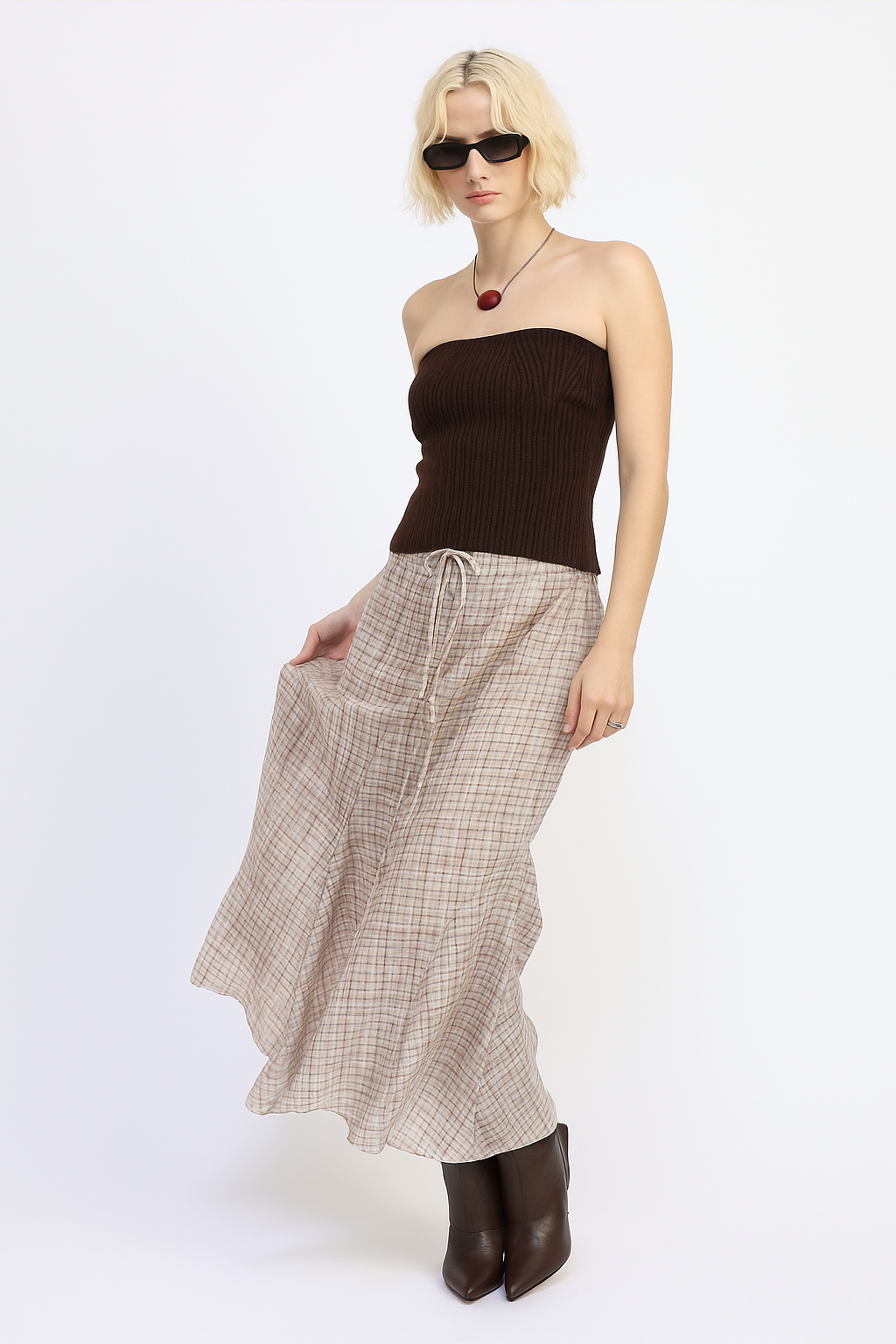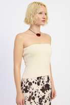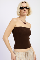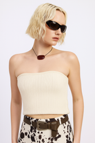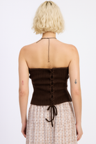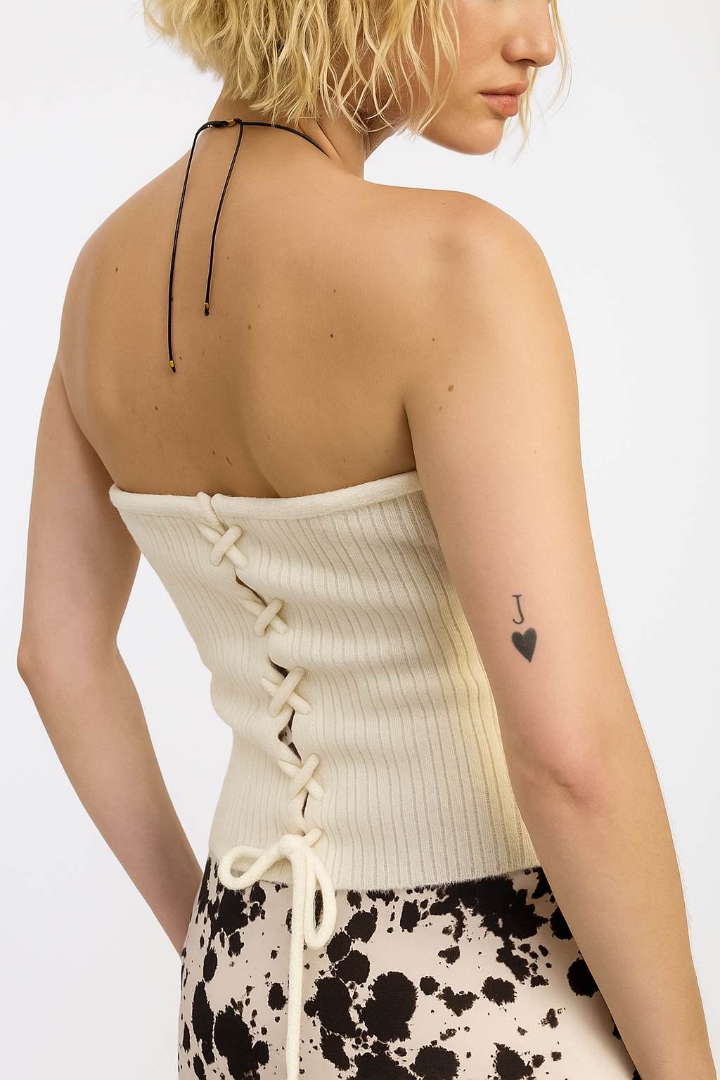Lace Up Sweater Tube Top features cozy knit fabric with adjustable lace-up detailing that creates a custom fit and edgy style appeal. The soft sweater material provides comfort while the tube design shows off your shoulders and neckline beautifully. Perfect for layering under jackets or wearing alone when you want to combine the warmth of knitwear with a fresh, modern silhouette.