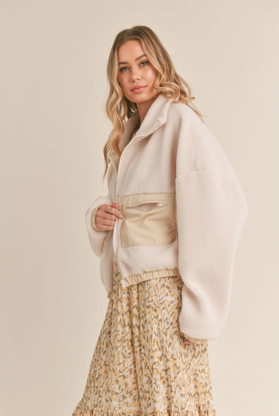 Embrace ultimate comfort in the Patty Fleece Zip Front Jacket, made from a super-soft Poly/Spandex sherpa blend. This zip-up jacket features contrast beige pockets and hem details for a stylish touch. Designed for casual warmth, the jacket includes an elastic bottom hem to provide a flattering, fitted look while maintaining ease of movement. Whether you're layering it over your favorite fall outfits or staying cozy indoors, this jacket is as functional as it is fashionable.