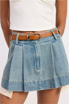 Pleated Denim Mini Skirt combines classic denim fabric with feminine pleated detailing that creates movement and texture in a flirty mini length. The structured pleats provide visual interest while maintaining the casual appeal of denim for versatile styling options. Perfect for pairing with crop tops, tucked-in blouses, or graphic tees when you want the comfort of denim with preppy, polished charm.