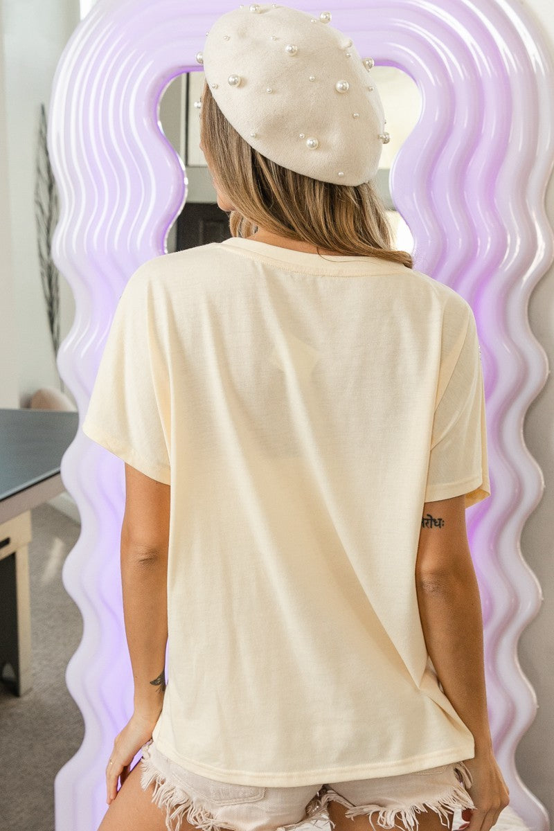 This top features intricate rhinestone bead embellishments on the short sleeves, adding a glamorous and eye-catching detail to the design. The rhinestones provide a touch of sparkle and elegance, making this top perfect for special occasions or nights out. Pair it with your favorite bottoms for a dazzling and stylish ensemble that will surely turn heads.