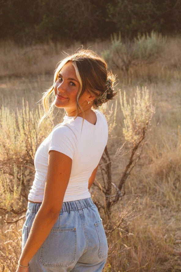 This jumbo scrunchie is the perfect back to school and fall season accessory. It is made in a pretty, green fabric with most perfect floral pattern. It'll be the perfect addition to your hairstyles this fall.