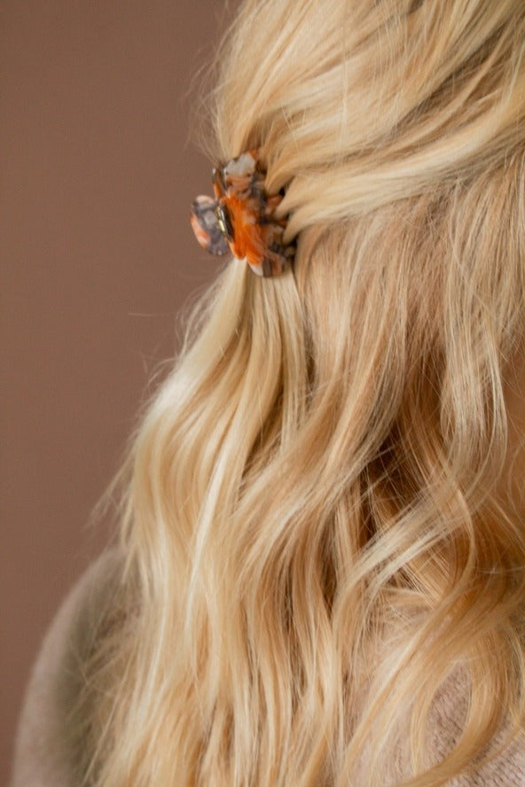 This unique & stunning claw clip is the cutest size, and is the absolute perfect color combo for this time of year! The best way to elevate your updo for the day. This is a mini size claw clip measuring at 1.5 inches.