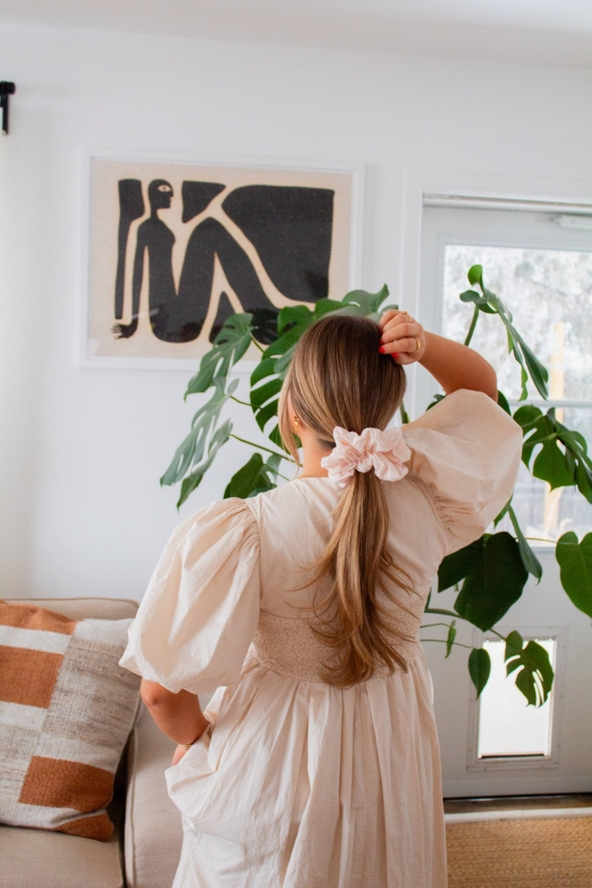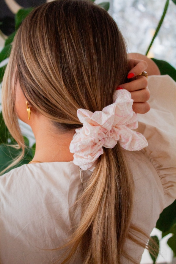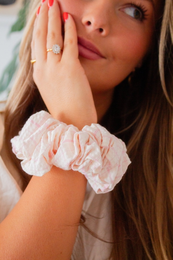 This jumbo scrunchie will be the best addition to your closet this season! Made out of a textured cotton fabric, it features a soft and subtle, pink and cream gingham pattern; it has the softest feel and is gentle on your hair. It’s perfect for any hairstyle your heart desires and will add a festive and cutesy touch to every outfit, on any occasion.