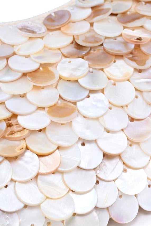 • Exterior: Layered shell discs in front, smooth satin back, and a removable gold                               chain to convert into a clutch.