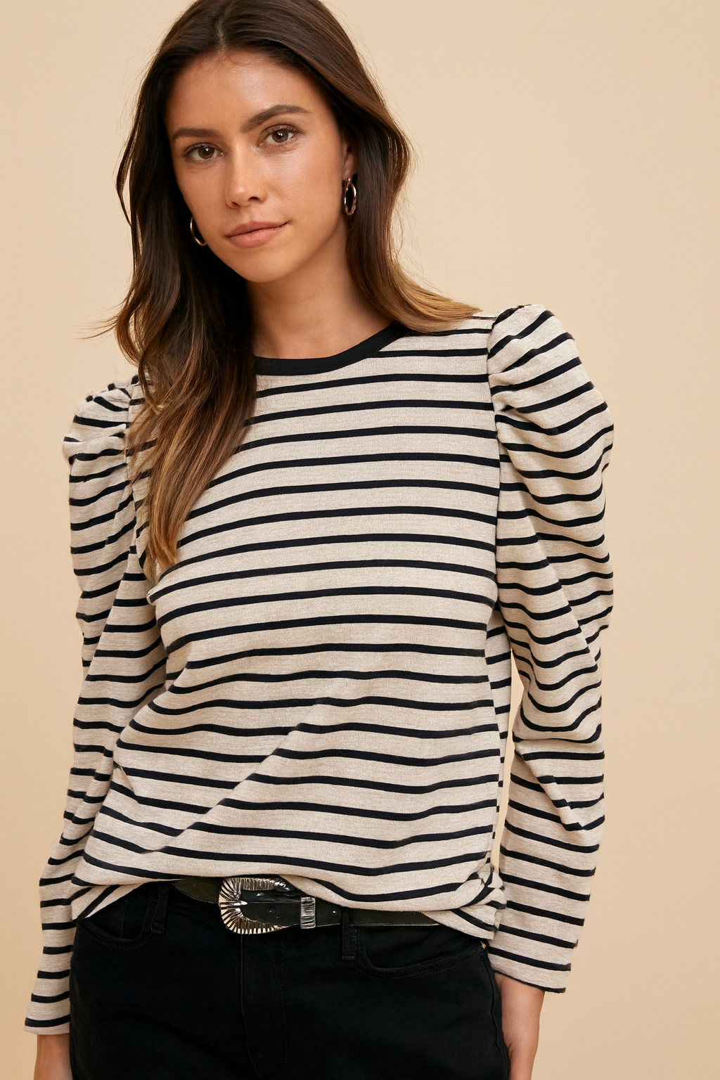The Striped Round Neck Puff Sleeve French Terry Top is a charming and stylish piece that combines classic stripes with trendy puff sleeves. The round neckline offers a flattering silhouette, while the puff sleeves add a fun and feminine touch to the design. Made from French terry fabric, this top is soft and cozy, perfect for everyday wear. The striped pattern adds a playful element to the top, making it a versatile and fashionable choice for both casual and dressier occasions. Pair it with your favorite bottoms for a chic and comfortable outfit.