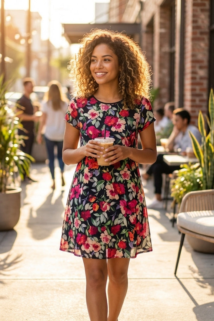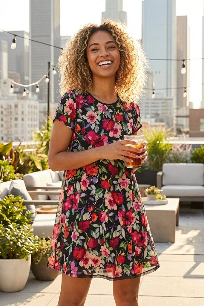 Introducing the "A Night in Mini Dress" – your go-to for any occasion. This dress features a beautiful black multi-floral pattern, offering a touch of sophistication and charm. Light and airy, it's perfect for those warm days and breezy nights. Its versatile design makes it a must-have addition to your wardrobe, effortlessly transitioning from day to night.